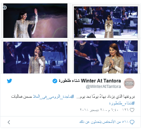تداول عدد من رواد مواقع التواصل الاجتماعي صورا من حفل المطربة اللبنانية ماجدة الرومي في المملكة العربية السعودية. وأضافت الرئيس الفرنسي تأثر لكلام سيدة. أبوظبي وجهت الفنانة العربية واللبنانية ماجدة الرومي مساء الجمعة كلمة للسعودية وشعبها قبل افتتاح أول حفل غنائي لها في المملكة ضمن فعاليات مهرجان شتاء طنطورة بمحافظة العلا. وقالت صفحات ماجدة الرومي على مواقع التواصل الاجتماعي أراد الرئيس الفرنسي أن يختتم زيارته للبنان بلقاء السيدة ماجدة الرومي تشديدا على رغبته بإبراز وجه لبنان الفني الحضاري.