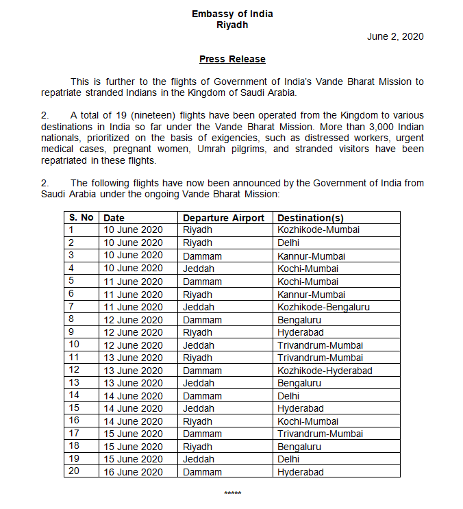 India In Saudiarabia On Twitter Corrigendum For The Embassy Press Release On Flights From Saudi Arabia Under Vande Bharat Mission From June 10 16 2020 Https T Co 3xafbvnyed